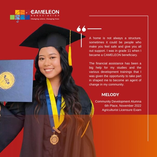 The eldest of three children, Melody was a beneficiary of CAMELEON’s Community Development Program from 2017 until June 2022. She graduated magna cum laude with a Bachelor of Science degree in Agriculture from Central Philippine University. Melody went on to place 6th in the list of topnotchers of the November 2022 Agriculturist Licensure Exam.