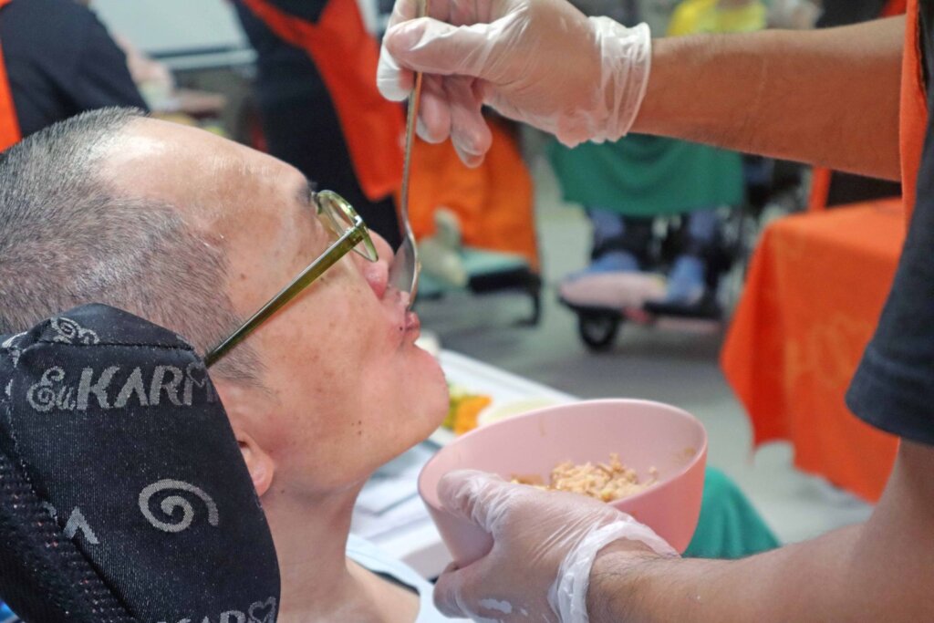 Mr. Mao, a resident in his sixties who became quadriplegic after a spinal injury, is one of our regular taste testers. He proudly says his father was a banquet chef, so he trusts his own sense of taste. Once, when pureed spaghetti was difficult to swallow, he suggested trying oil noodles instead. The change worked much better, and the kitchen team happily learned from his advice.
