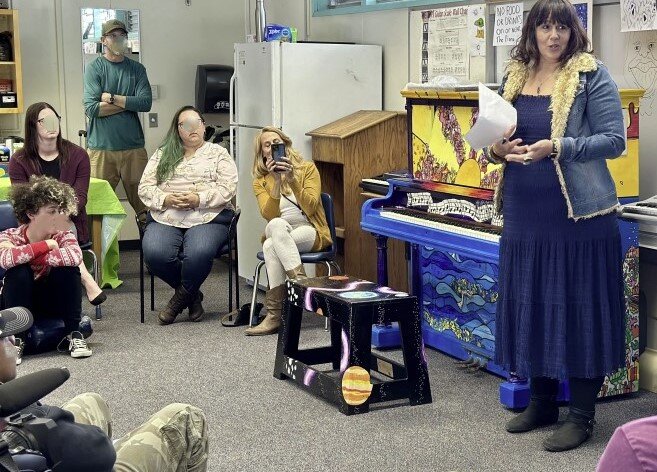 We have been fortunate to team up with one particular school psychologist, Felicia F., in her journey of musical caring, first at Valencia Parkway Elementary, and more recently at Marcy Alternative Learning Community, a high school for students with prevelant emotional support needs. Marcy is an extraordinary public high school, a safe place for suffering kids to get whole, grow stronger, and find their voices in the world. Felicia's incredible creativity has made this a musical experience for many.