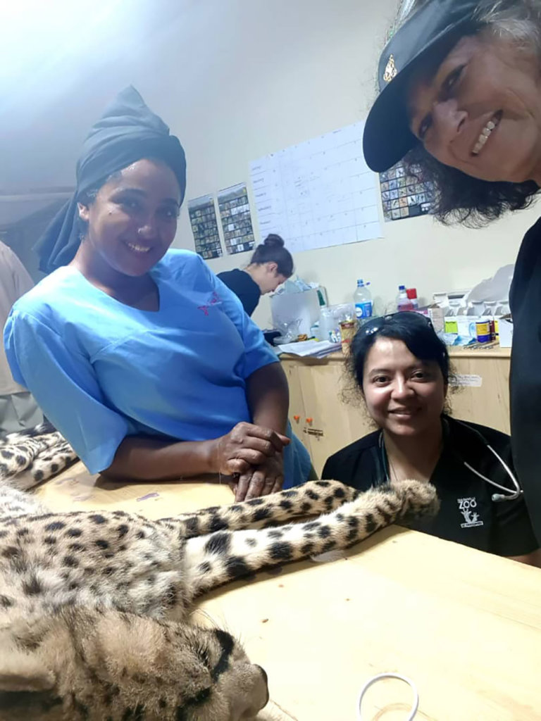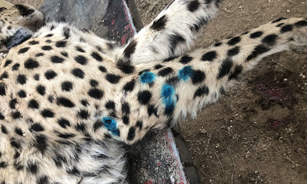 Functioning with only about half of its 25-person team, the CCF cheetah scientists conducted comprehensive health examinations of the two cheetahs. Working at a more deliberate pace and wearing masks to cover their noses and mouths, the team checked the animals from head to toe for signs of injuries or chronic health issues. They weighed and measured the animals, drew blood and tissue samples, and photographed each cat. Although this activity has taken place hundreds of times over the past three decades at CCF, it has never happened during a pandemic.