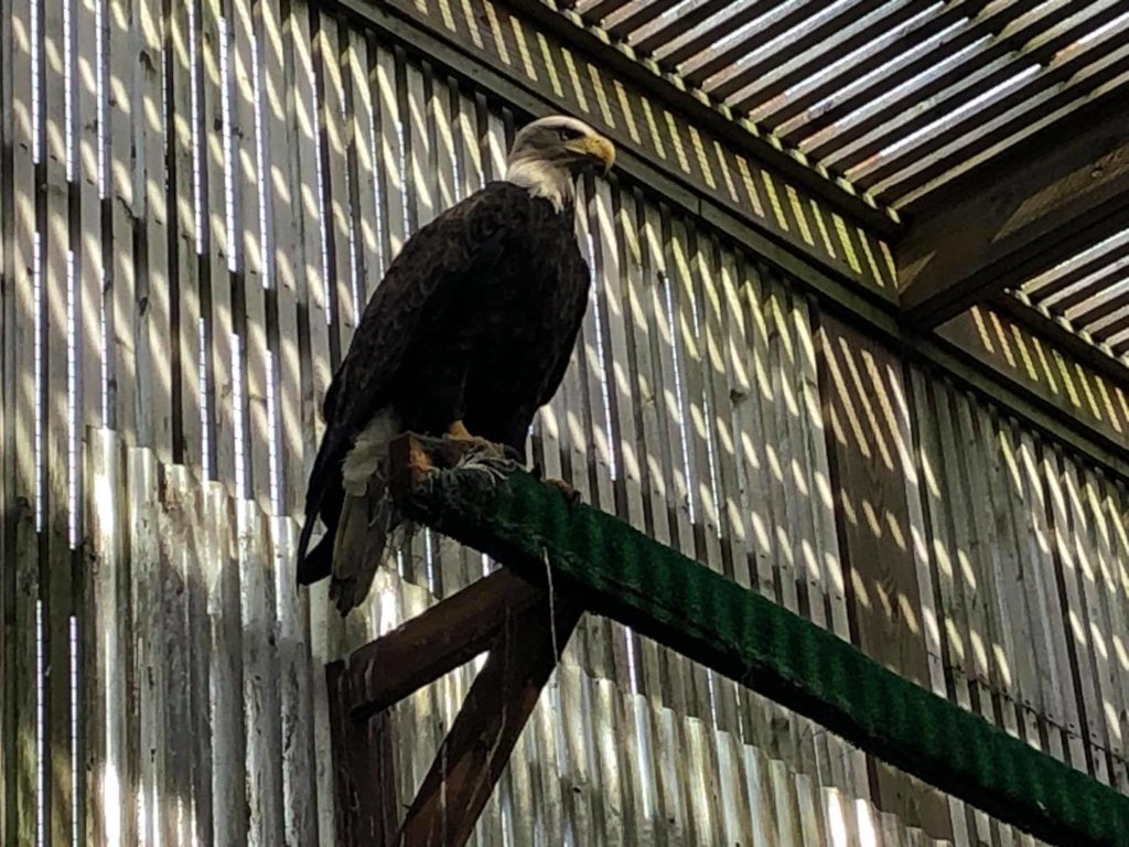 At first, Fontana could hardly stand, and we housed him in our raptor preflight, an indoor room with a carpeted floor, low soft perch, and with supplemental heat and low light. He was in good weight when he arrived, about 8 pounds, which is why we identified him as a male. Females are much larger than males. The largest female eagle we have ever had in care was 14 pounds.