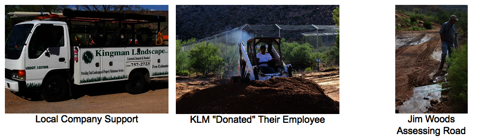 Keepers of the Wild is also fortunate to have received the expert help and assistance donated by Kingman Landscape Maintenance. KLM owner Christ Burkett donated his Bobcat and operator (Luis) to assist our staff members in rebuilding and repairing the roadways. Our staff members went into action to remove vegetation debris that built up as a result of the flood waters. Board of Directors member Jim Woods contributed his knowledge as a geologist in evaluating the damage and future storm-water diversion plans.
