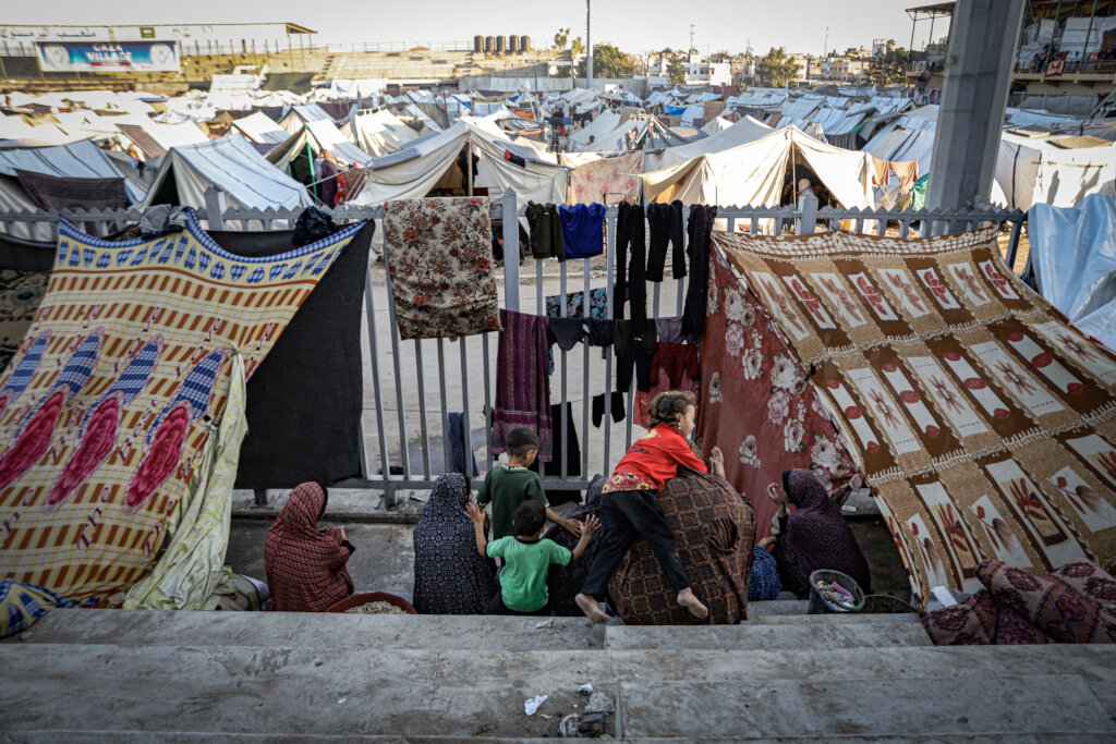 “Now it has been turned into a camp for the displaced, for families forced to flee their homes as they have been destroyed, or risk being targeted. Women who have lost their homes sit on these stands—some have lost their husbands, children, or other family members, each carrying her own story.”