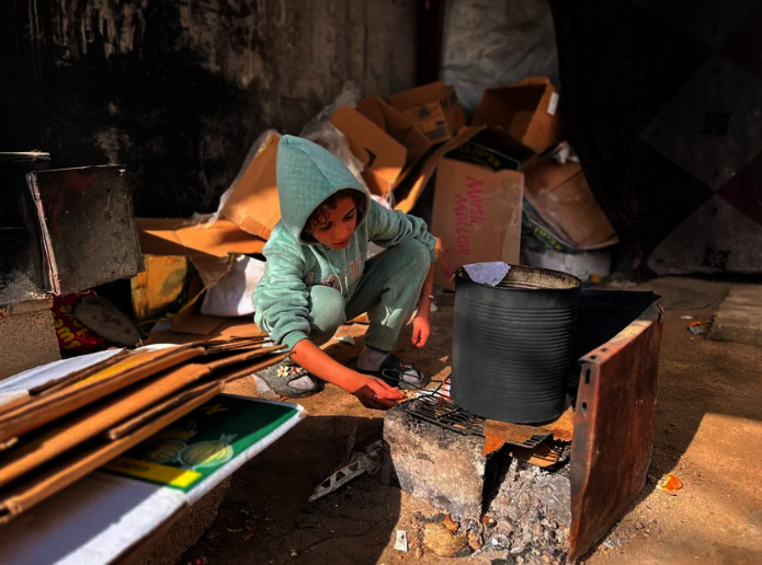 Image 2: Farah, uses cardboard and pieces of wood to cook with. Image credit: Juzoor for Health and Social Development.