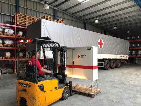 Water and hygiene: Delivery of fifty 1,000 liter drinking water tanks (25 distribution points with 2,000 liters each), daily supply of 140,000 liters of drinking water, provision of hygiene points with washing and showering facilities, distribution of hygiene kits, protective clothing and information material to protect against infections