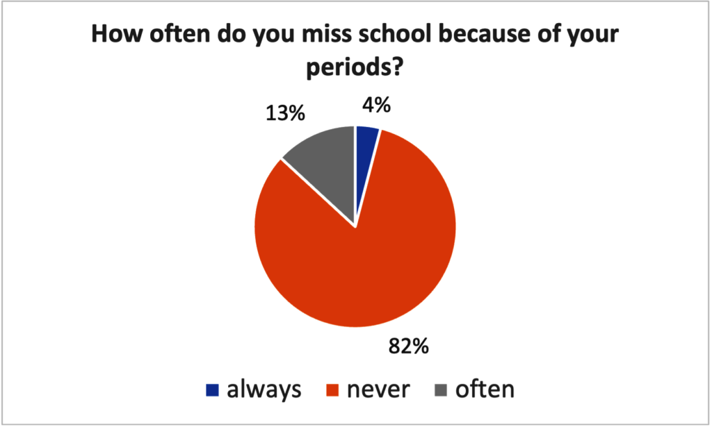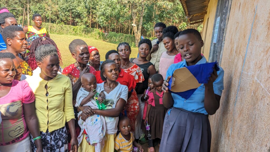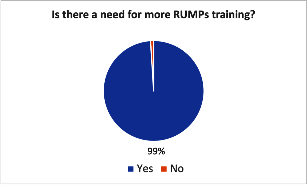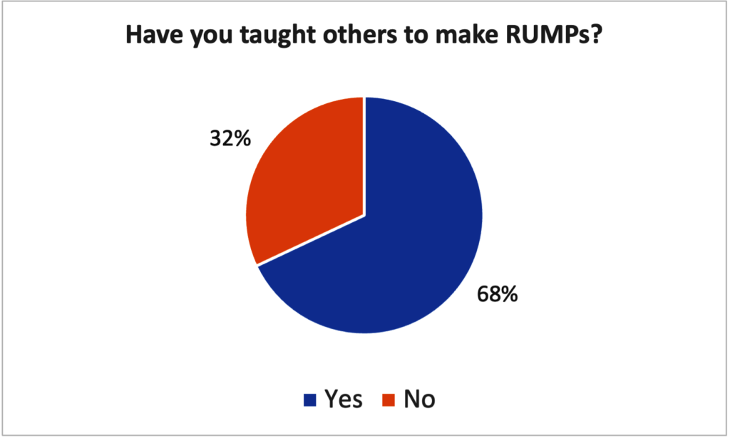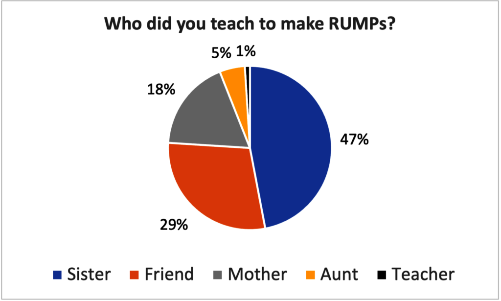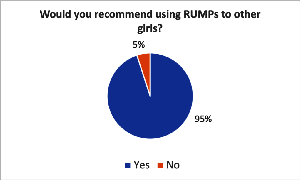 In 2023, our trainings which are carried out in after-school health clubs, reached more than 800 students across our 16 partner primary schools located around Kibale National Park. Demonstrations were also made to around 6,000 others outside our clubs. We asked more than 400 of our trainees to tell us about their experience with RUMPs, and we summarized their responses in the graphs below. Nearly all girls (95%) said they would recommend RUMPs to other girls and, after their training, most (68%) said that they had trained other girls to make RUMPs, especially their sisters (47%). Most girls (82%) also shared that after learning how to make RUMPs, they never missed school because of their periods. Finally, 99% of girls said there was a continued need to teach this skill to other girls in their schools.