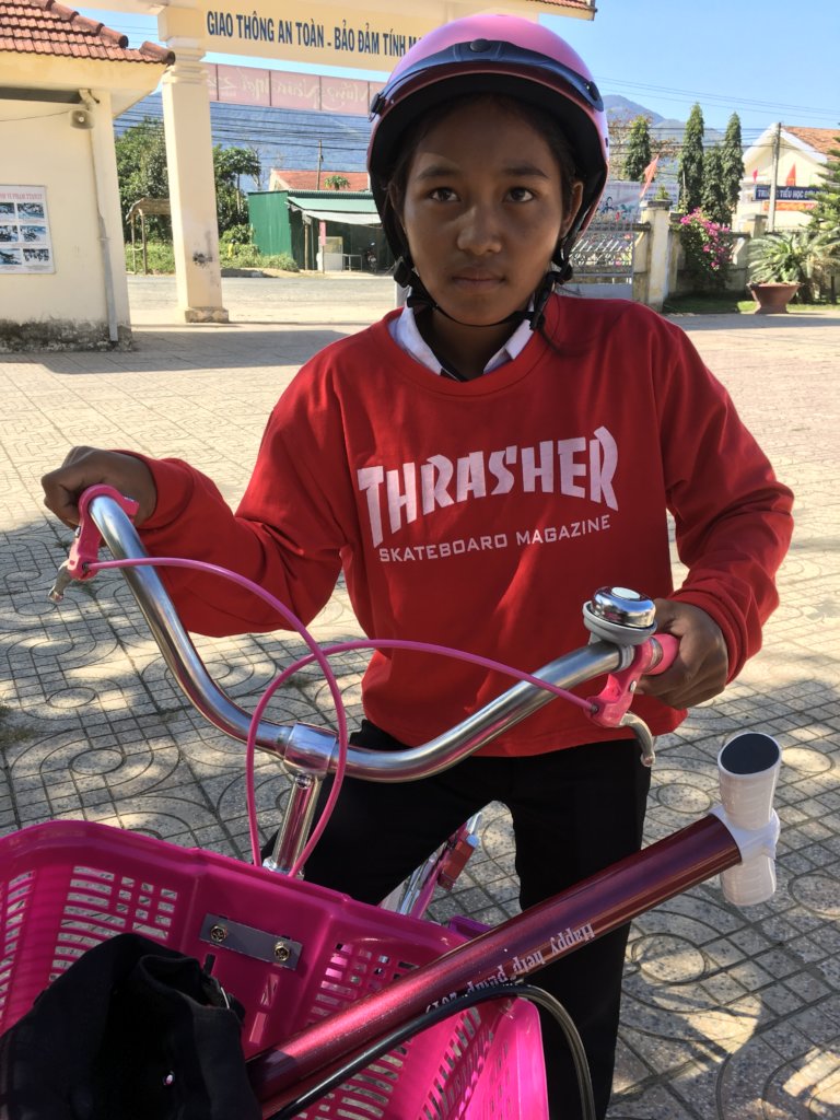 For Thi going to school is something special, because her family members before her either never went to school or dropped out at an early age. Next year, she is planning to go to high school, which in Vietnam for most minority girls living in these rural villages, is a tremendous accomplishment. The high school that she will be attending is the only one in the village, and it takes an additional 15 minutes to reach. Thi was so happy to receive her new bicycle to help her make this daily journey.