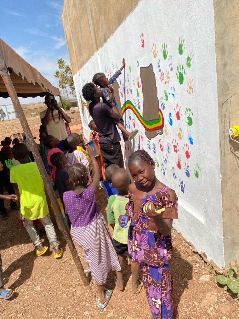 Continuing with art projects, ACFA teenager Alassane and students from the American International School Bamako (“AISB”) painted a mural on the wall of the dormitory at the Complex. The mural includes maps of Mali, Côte d’Ivoire, Niger, Mauritania and Ghana, all linked by the national colors of Mali. The toddlers of the Complex joined in and put their handprints with paint on the mural.