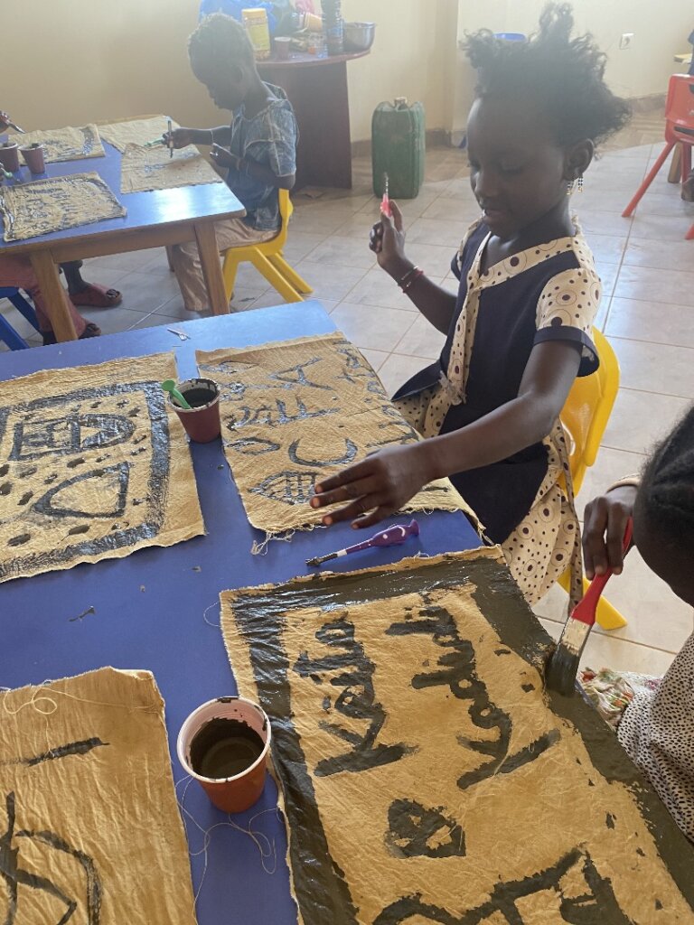 In its’ strategy of diversification and improved opportunities for Mali’s vulnerable children, ACFA has now implemented an arts program. ACFA hosted its first new artistic event: mud cloth painting, known in the Bambara language in Mali as “bogolan,” meaning “made with the earth.” Bogolan is Mali’s renowned dyeing technique of cotton material, made with natural dyes. This event was made possible thanks to the pro bono support of Korka Kassogue, a renowned Malian artist designer, comedian, and photographer. After introduction to the concept of bogolan, the tools, cloth, paintbrush etc., and observation of Korka’s execution of a sample, the children were each given their own canvas to paint on their own. Art is a good way of expression for children and can help educators to detect talents and provide guidance for vocational training.