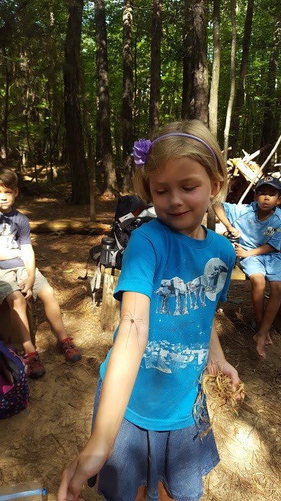 Despite the fact that the creek is tiny and intermittent, we have seen that it supports plenty of wildlife. We find crayfish there often, and we’ve seen toad eggs in the deeper pools! Earlier this week, when we were talking about “creek critters,” our new student, Ramona, commented that "water is still important for animals that don’t live in it", using dragonflies as an example. Other kids were amazed to find out that dragonflies do live underwater for part of their lives. They were even more excited when we explored the creek with dip nets and discovered another insect that starts out in streams: we caught a worm-like young crane fly hiding under leaves.