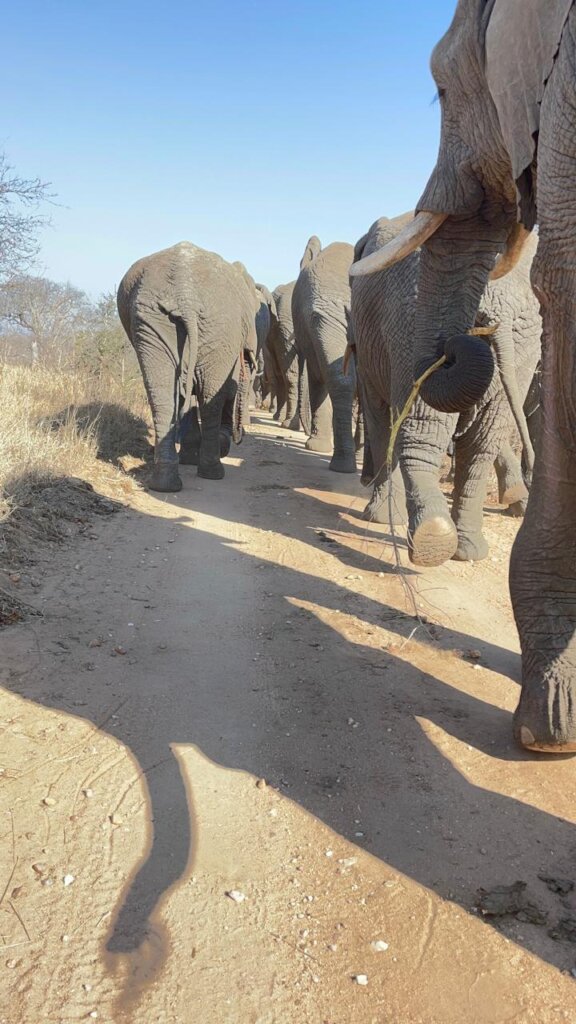 A few weeks ago, Adine encountered the wild elephant herd while driving through the reserve. The cows, babies, and young bulls were in a playful mood, causing a little mischief before they peacefully passed by her car. It was a reminder of the natural behaviour of elephants, as part of the larger herd had split off into smaller family groups—an instinctual move for safety and resources. But the magic didn’t stop there. A lone lioness appeared on the road, calmly strolling by. These rare and breathtaking moments show how extraordinary the African bushveld truly is.