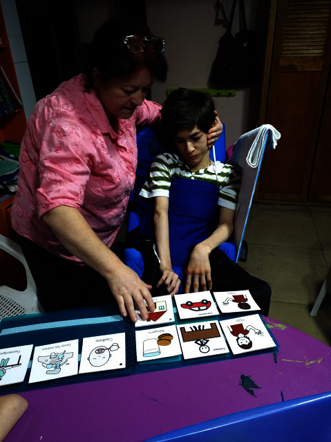 He recognizes visual images. With these he is anticipated to his routine by pointing what he wants. With the support of his mother he handle the routine all day long.