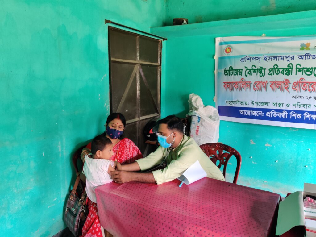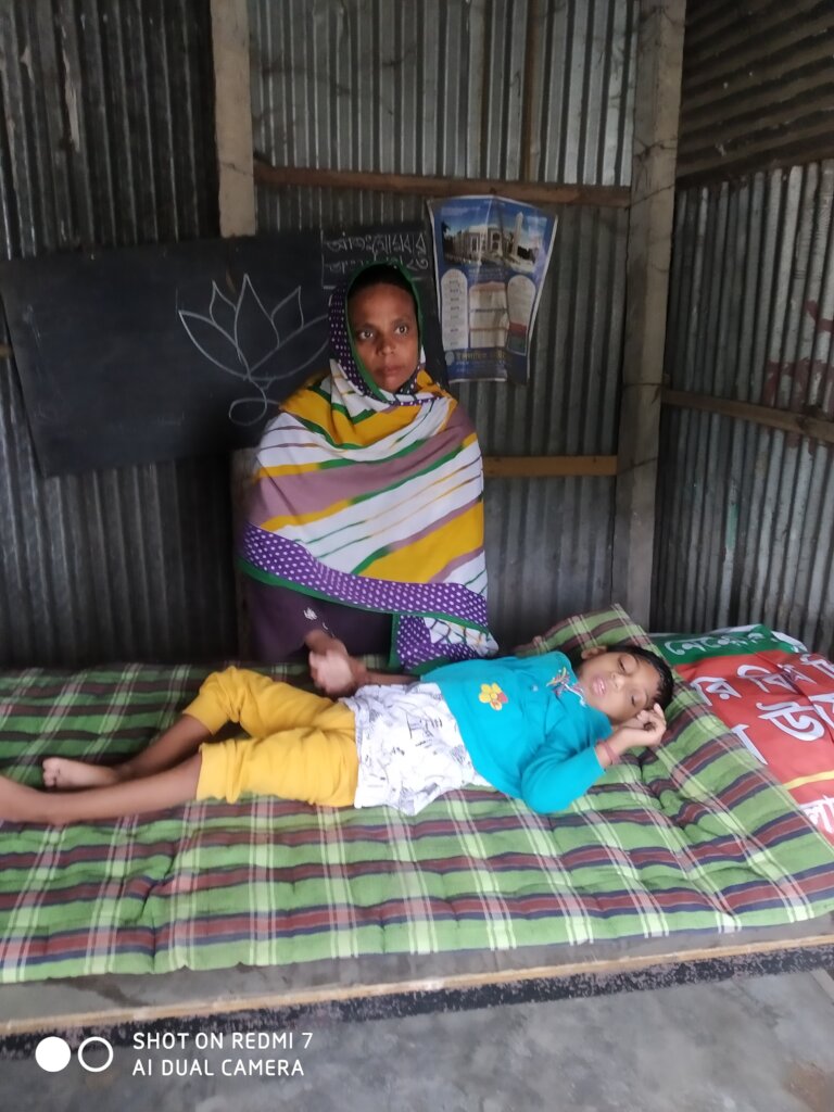 Kamona Rani (anonymous) is a Mother of children with disabilities with Cerebral palsy in our working area at Mowjajallah village of Islampur upazilla under Jamalpur district northern Part of Bangladesh. Mother very much tensions feels with their child health because home is far distance from urban medical Centre. Parents are illiterate and care less and not aware about their treatment and also suffers from inferiority complex. Her parents are very poor day labor and Mother is house wife. Parents cannot bear any cost of the health services like Doctor services fee & medicine. She came to our treatment camp for children.