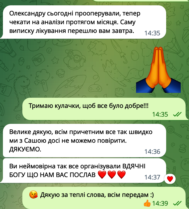As a result of this unexpected and heartwarming turn of events, the funds raised for Olexandra's surgery will be reallocated to "Support Ukrainian children of war" project that aims to help children who have lost one or both of their parents due to the war in Ukraine. We are incredibly grateful to all contributors for their generosity and support.