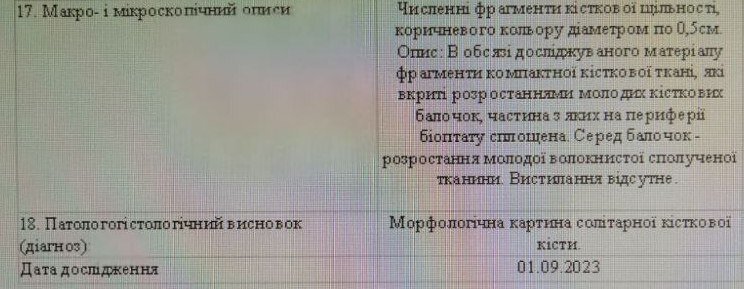 This miraculous turn of events has brought immense joy and relief to Olexandra's family. The family lives in Nikopol which is heavily shelled but they don't want to leave their home. Olexandra has been through two operations - one took place right after the incident and the other one was a biopsy of a tumor (21/09/2023) that turned out to be a benign formation. Now, it has become evident that her bone is regenerating naturally, eliminating the necessity for the previously planned surgery and implant.