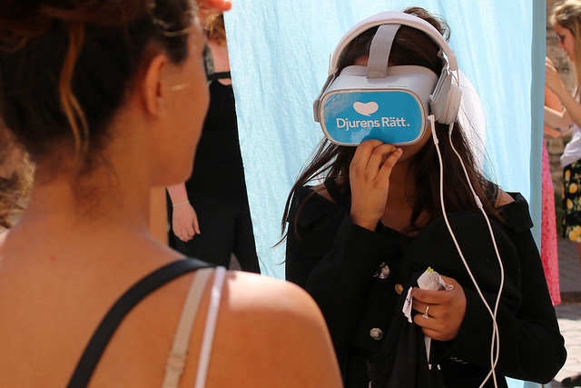 Chickens make out the absolute majority of animals killed in the Swedish meat industry and they also suffer some of the worst conditions. Djurens Rätt wants to spread the word about chickens and show the reality behind Swedish chicken meat in grocery stores. At all tour stops the “99 miljoner” campaign is the outreach focus. This summer we are collaborating with the global animal protection organization Animal Equality and their virtual reality (VR) project iAnimal. At some tour stops we are showing visitors the iAnimal chicken VR-video in which the viewer is transported inside a factory farm and a slaughterhouse. There has been great interest among visitors to watch. Many viewers express shock, anger and grief about chicken’s conditions after watching. The VR experience affects a lot of people more than words ever would do.