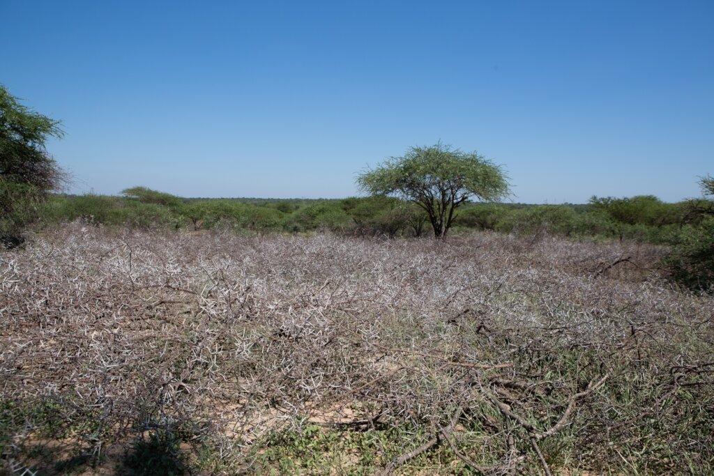 Brush packing forms part of our work to restore and maintain the land. This helps vegetation to be slowly rehabilitated. First, it requires us to dig up the compacted ground and then we start to plant wild grass seeds, adding on a layer of our very own elephant dung on top. Lastly, we pack the entire area with thorny branches to stop herbivores from eating the grass while it is establishing itself. Over time, the branches will decompose and create nutrition for the soil and the grass will start to spread. We have witnessed the success of this in many parts of the reserve where we have carried out this work, with the help of our conservation students and the JabuLadies, our HERD women’s empowerment initiative.