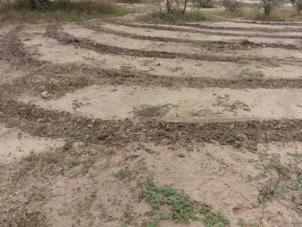 When there are open areas of soil, there is nothing to slow down the flow of water which in turn causes it to flow faster and wash away important topsoil. We therefore rip small trenches into the soil in contours with the slope of the ground which helps to slow the water flow and collects biomaterial and seeds washed down by the water. Slowly the area should start to sprout grasses and stabilise.