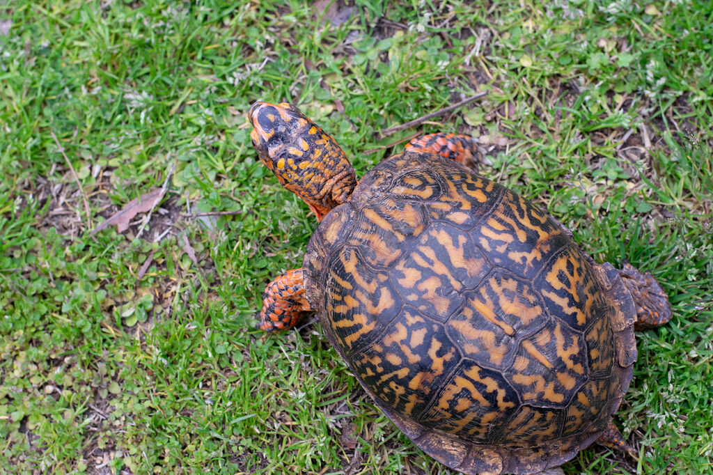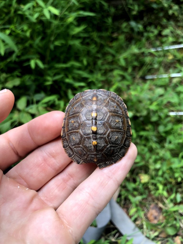 This female box turtle is over 20 years old and has been part of our radio telemetry project since 2011. Long term data collection is important for species like eastern box turtles who can live over 50 years. By tracking their movements, we can learn more about their home range and preferred habitats. With urbanization and habitat fragmentation increasing, it is important to understand where box turtles live and how far they travel. Roads and cars remain some of the biggest threats to turtles in the wild.