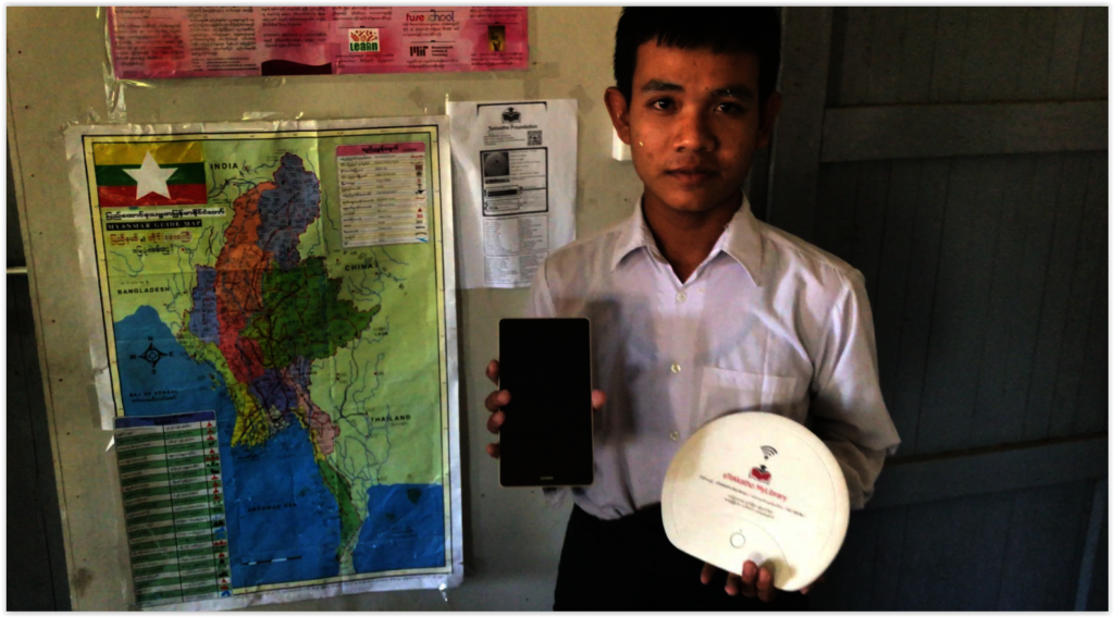 The photo, taken in January, shows children learning with MyLibrary. The MyLibrary digital library is the white disc on the tabletop. Inside the library are thousands of resources designed to support school children in Myanmar, all adapted to work in places with no internet connection, like this school in Magway.