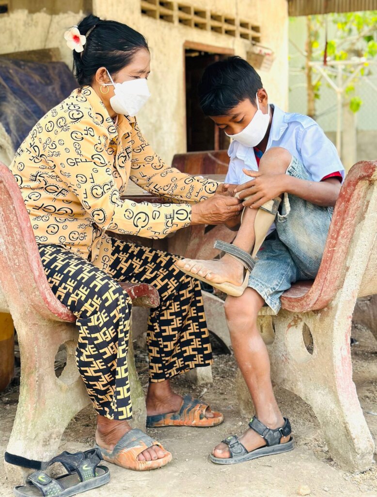 Every year, children in CIF’s care are re-assessed through the Child Status Index, a tool which tracks child wellbeing in six domains. A screening tool is also used to track the child’s development and identify possible signs of developmental delay or disability. When Sophat was about six years old he was suspected of having a disability, He was referred for definitive diagnosis. A local hospital confirmed that Sophat had mild cerebral palsy and required intervention, including serial casting and bracing for his left foot. He was also enrolled into CIF’s ABLE services to receiving ongoing support related to his disability. This support includes coordination for specialized services, provision of home-based rehabilitation, and training the parents on stretching and proper use of the brace following the advice from his doctors. The serial casting and brace use achieved good results and Sophat is able to function well.