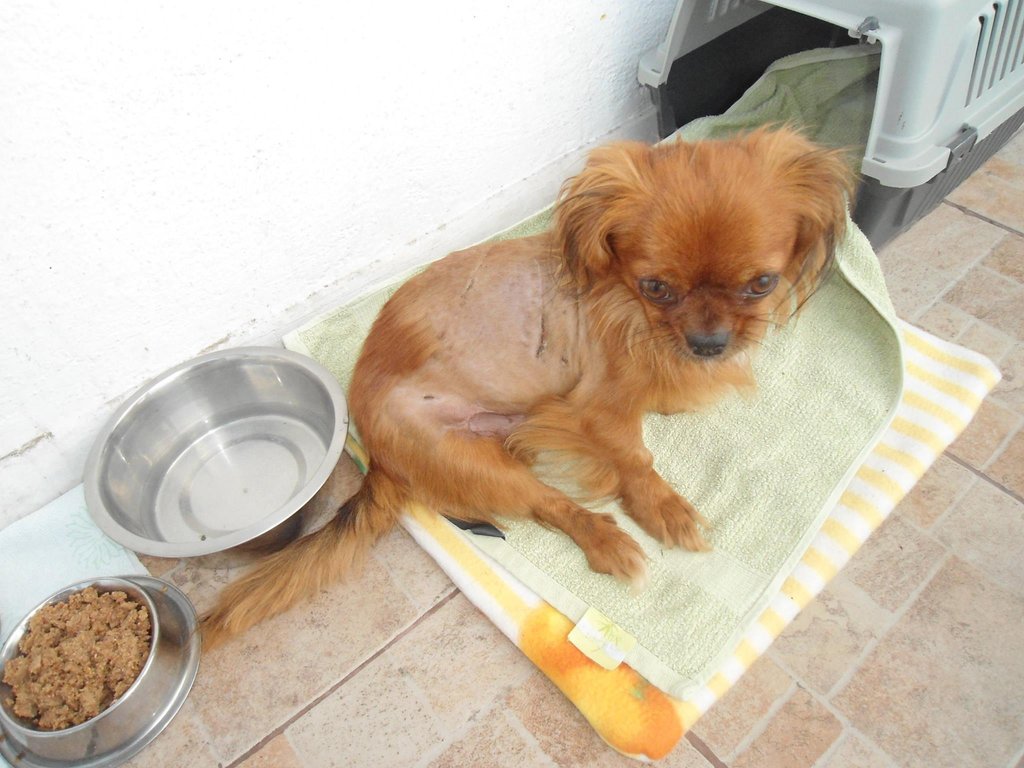 First appearances can be deceiving as there were just a few puncture wounds to the skin. The bite had caused a hernia, a tear in the muscle wall, if left his intestines might pass through and become occluded. X rays showed six broken ribs. Costa was in a serious condition and was rushed to surgery as soon as he was stable for anesthesia. There was no guarantee the little dog would survive. The hernia was repaired without complication but the chest injuries were much more complicated than was anticipated. Under the small bite holes the muscle was severely traumatized with more holes leading straight into the chest cavity. Once these were uncovered Costa could no longer breathe for himself and he had to be manually ventilated under controlled anesthesia whilst his ribs were wired and all of the tears in his chest muscle were sutured. It was a long surgery but the plucky pup pulled through. Even with two types of IV antibiotic and daily cleaning of the wounds Costa still battled infection from his bites. It took almost 2 weeks of hospitalization before he could be discharged and his ribs and muscles are still healing.