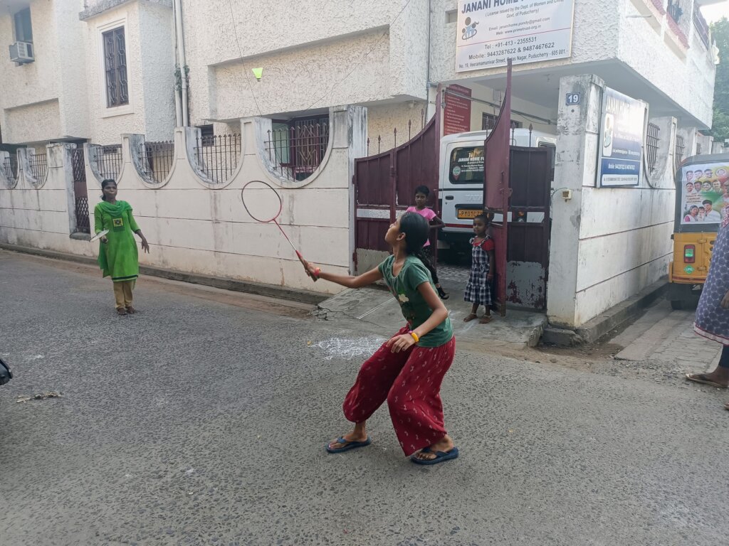 Every day children at Janani Home spend time playing badminton. Children are excited to play. They do cycling and also take up running and jogging exercises.