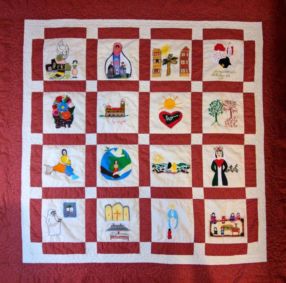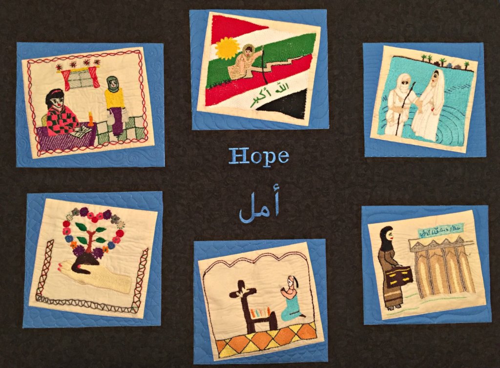 Recap and history: First a reminder of how it began. In 2016, we launched an appeal on Global Giving on behalf of the Hope Workshop, an association of refugees that was started by our partner in Jordan, the Collateral Repair Project. The appeal raised $500 from 14 donors and made it possible for our Peace Fellow, Allyson, to start embroidery training for 12 refugees. The women told their stories through embroidered squares, which were brought back to the US and assembled into advocacy quilts.