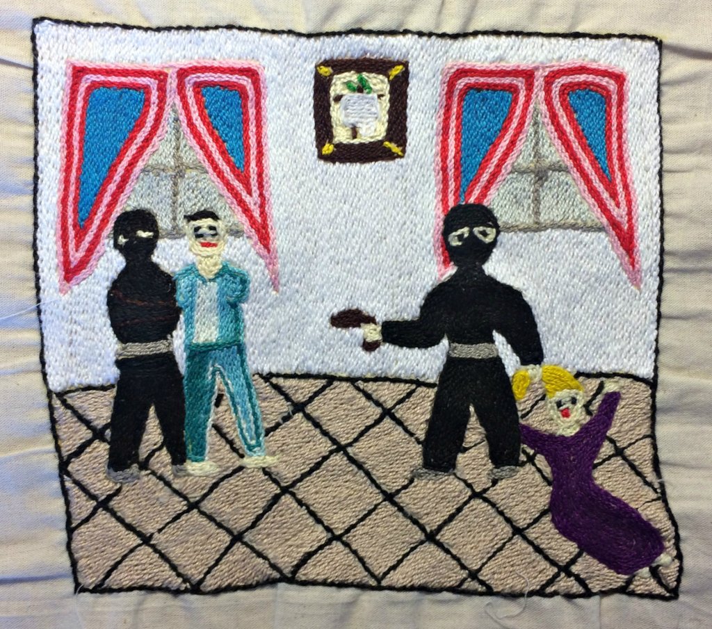 Telling the story of refugees: Embroidery has enabled the Hope refugees to describe not just their own ordeal but the sort of terror and uncertainty that faces refugees everywhere. We show one square below, made by Jenan, who lived in the northern Iraqi town of Mosul. It shows the family house being attacked by ISIS fighters. The artists began to produce more gentle images in 2017, with the aim of selling their embroidery (last photo). But their earlier depictions of violence continue to make a powerful impression, made more poignant by the exquisite needlework.
