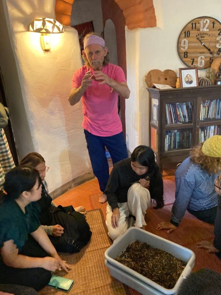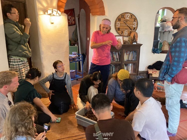 The next day I returned to give an Introduction to Vermiculture talk which was again very well received. People in SE Asia generally don't have an immediate affinity with worms, as they are rather reminicent of snakes in their minds. However, once they hear about the benefits of worm farming - the worms work 24/7, they live on scraps and they produce the richest soil ammendment - the local people become much more interested. This time, a "photographer" was on hand and we got a couple of documentary shots. It was interesting to meet so many urban dwellers who have given up the stressful life in Bangkok and have moved the peace and quiet of Northern Thailand. Interestingly, there was also a contingent of folks who have fled Singapore and who are now learning organic gardening and mud- house building at Pun Pun.