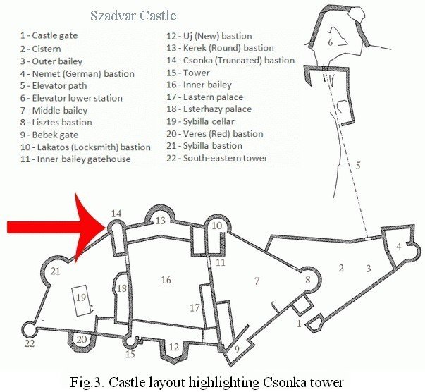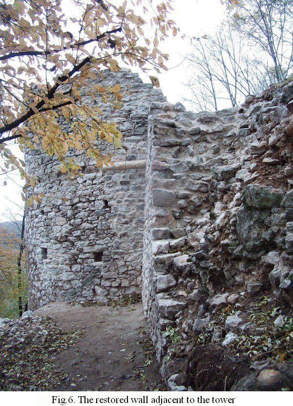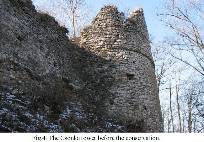 The summer activities concluded with the completion of the conservation of the still 40 feet high walls of the Csonka (Truncated) tower. Despite its name this building was the only tower of the castle which was not demolished by the Austrian forces in the 17th century and it survived the last 300+ years in quite good condition. It was named after the damages during the siege of 1567. ( See No. 14 on the layout for the location of the tower. ) Preserving and partly rebuilding the Csonka tower gives us a possibility to have a locked and safe place where the tools and essential construction materials can be locked and kept so the volunteers will not have to carry everything to the top of the mountain every time we climb up to the castle.
