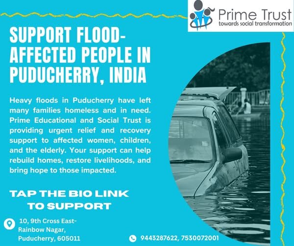 The Flood Relief Project in Puducherry stands as a testament to community spirit, timely action, and the power of collective compassion. Prime Educational and Social Trust remains committed to standing with vulnerable families — not only in times of crisis but also through their journey toward rebuilding and resilience.