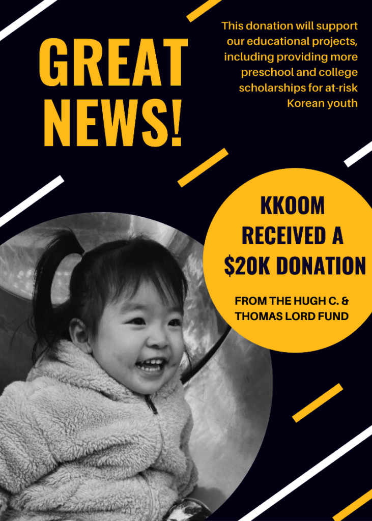 KKOOM is so excited to share we received a $20,000 donation this spring through GlobalGiving, who recommended KKOOM to a family foundation. This generous donation from the Hugh C. & Thomas Lord Fund will be used to fund several of our educational projects and programs -- one of which is an exciting project we are planning for the summer! Our long-standing programs, such as the educational scholarships will also benefit from this donation. We are grateful to impact move lives through our preschool scholarships so Korean children can dream bigger!