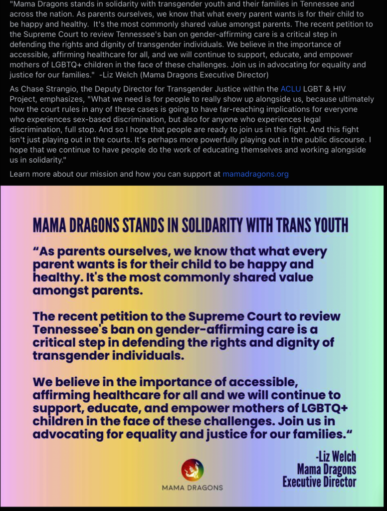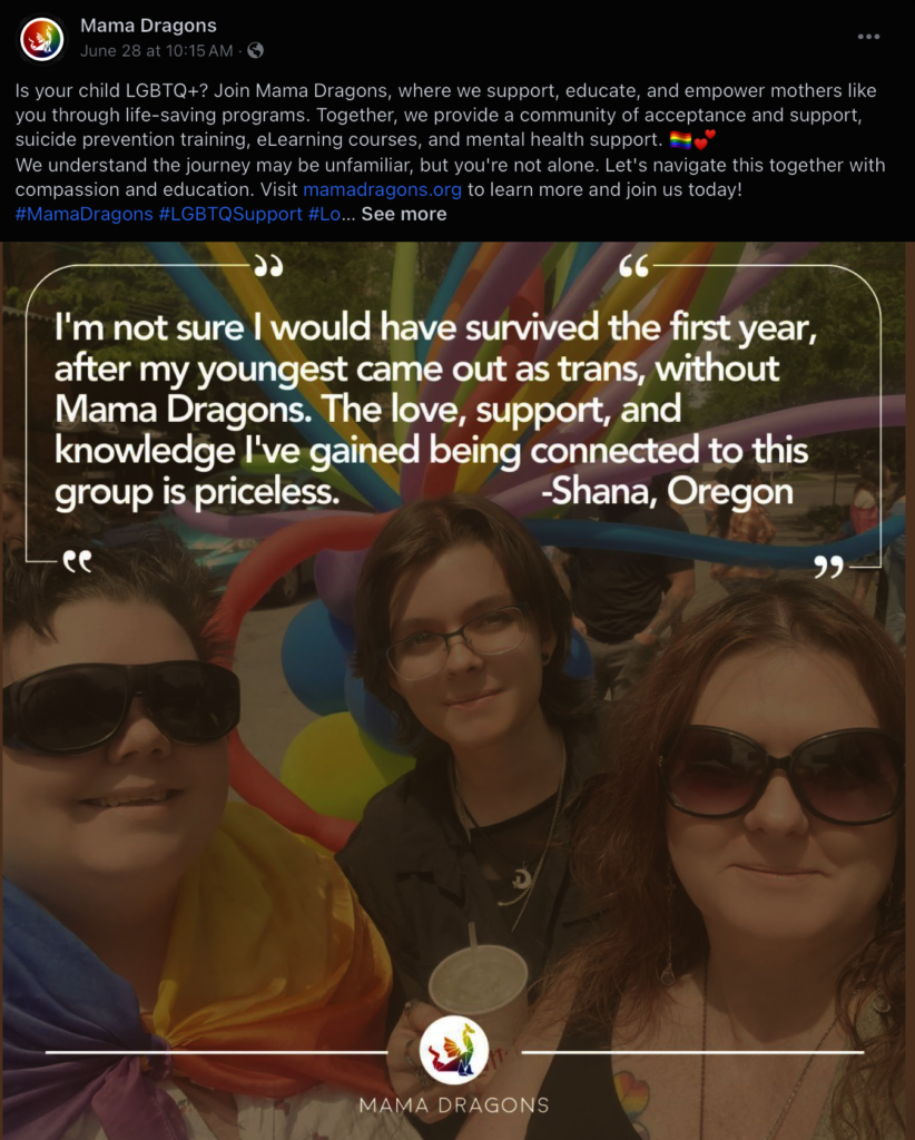 Mama Dragons is planning forward to how we can best support our parents heading into the next 4 years. Part of that work is moving our extensive private Facebook groups to a more secure, private space where parents can still have the important discussions that help them to grow in their acceptance, affirmation and celebration of their kids. This means we have to be even more strategic and thoughtful in how we communicate on social media to help those parents stand strong, not lose hope , and find our supportive community.