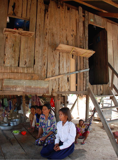 We sat in the coolest place, which in most Khmer homes is under the house and as far as the hot summer sun as possible. Srey sat with her grandma, on a low, traditional wooden platform. On her face a wizened smile beyond her years.