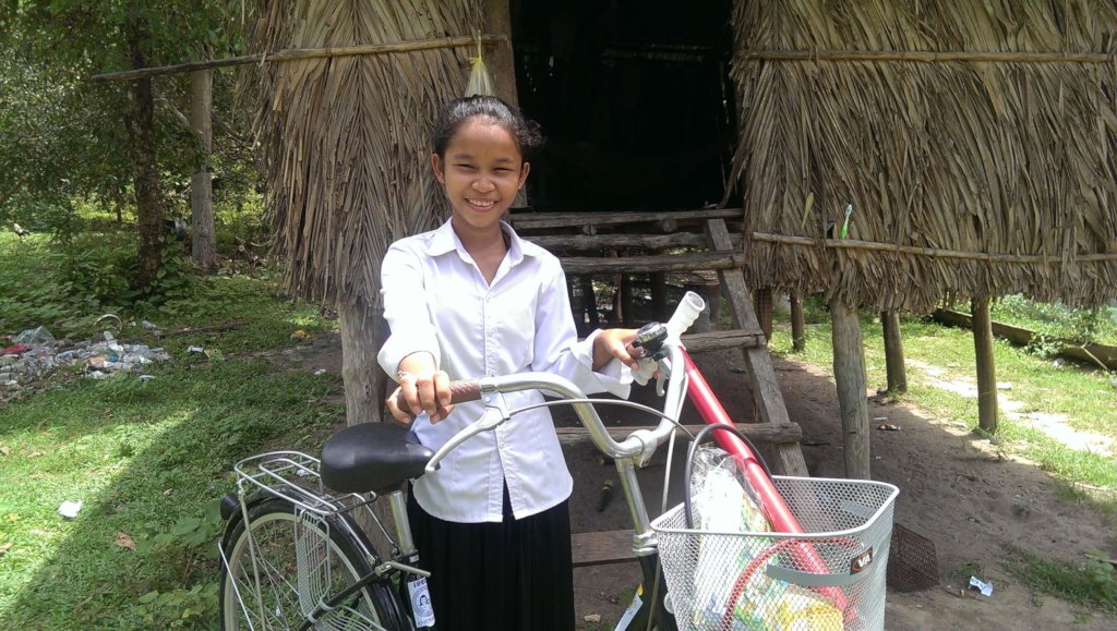 Sreykat is 13 years old and studying in seventh grade. "The reason that I go to school is because I have a dream, which is to become a teacher of Khmer Literature. I think education is very important because if we are not educated, it will be hard to get a job. When we are educated, it is very easy, we can do any work," Sreykat explained. "Before getting this bicycle, I had an old bike that broke down very often and the brake didn't work either, so I was always worried that I would hit people or fall over because of the bumpy road. I am very happy to have received this new bicycle. Thank you (the donors) so much for your generous support."