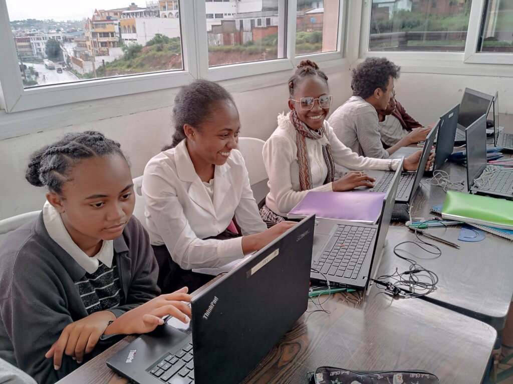 The Passerelles Numériques Madagascar (PNM) project contributes to the integration of young Malagasy people into the digital sector, particularly targeting young women in order to help young people and their families escape poverty sustainably. In 2024, we selected the fourth class supported by PNM, which will start in 2025. Our actions reached 825 young people through an awareness campaign conducted in 15 high schools, with 79% female participants. The objective of these sessions was to encourage high school girls to consider careers in digital technology and to overcome gender stereotypes. The particularly rigorous selection process resulted in 256 applications being received and 50 new students (at least 50% of whom were young women) being selected for the next class, which will start in January 2025.