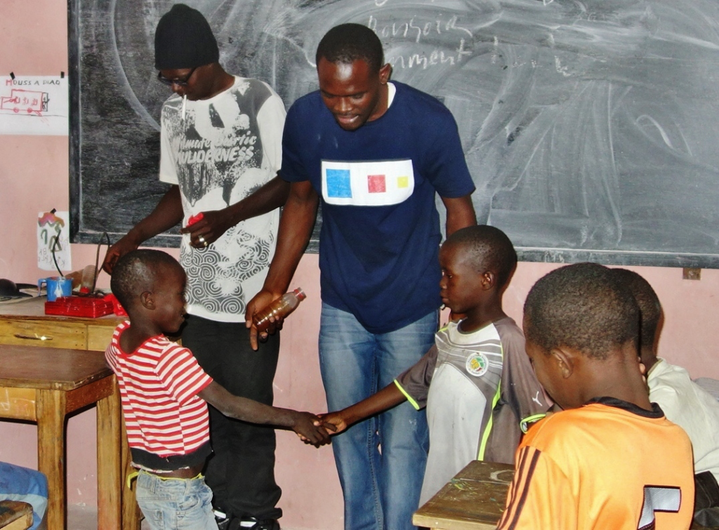 Most of the dozen talibés who were registered at the Sor-Karaté dojo in March 2015 have progressed impressively and will soon be testing for their orange belts. Issmaila, a "grand talibé" who assists with instructing the Maison de la Gare morning karate classes, has recently earned his green belt. These "dojo talibés" train at the dojo most nights each week. For some, karate has become a consuming passion.