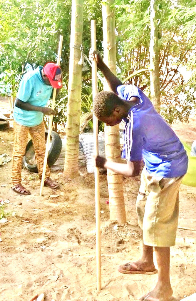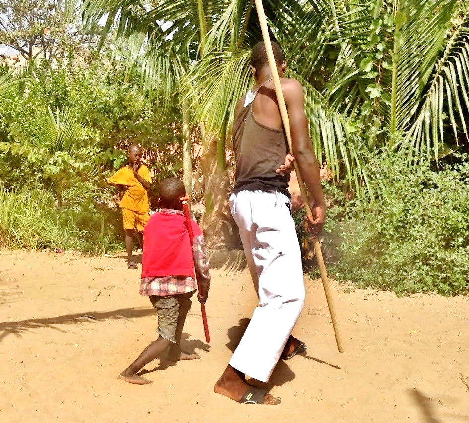 The morning following Issmaila's introduction to the Bo, after karate classes, five children asked Robbie to teach them Bo as well. It later was noted that several broom heads were lying discarded, stripped of their broom handles which are now being used as Bo's. It is also likely there is also a shovel head now missing its handle. Mamadou discovered an alternative to broomsticks, and the talibé karate kids were soon at work sanding and perfecting their new Bos. Issmaila is such a committed karate student, and such a fast learner, that he is now able (and very willing) to continue teaching the karate Bo lessons.