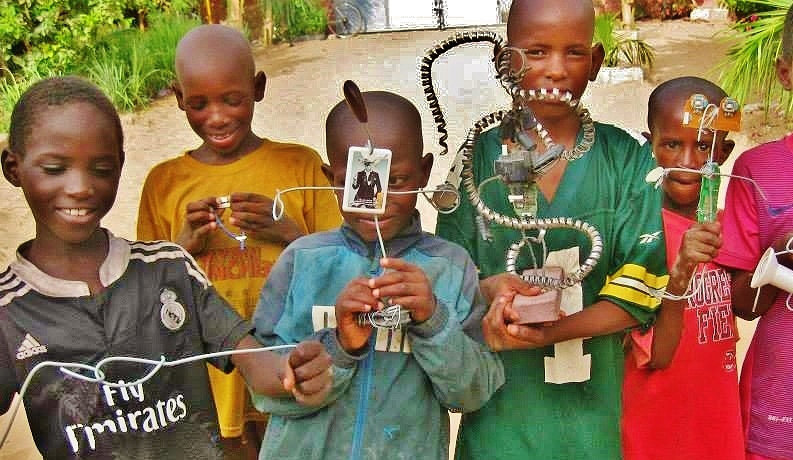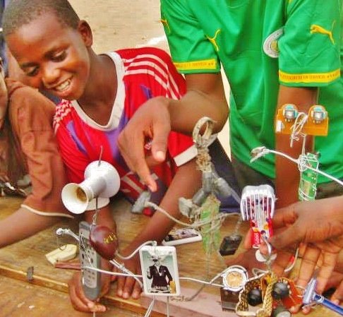 Paco, a Saint Louis artist, was introduced to Maison de la Gare by Terres Rouges, a Belgian non-governmental organization. He started to teach the children how to make use of the incredible assortment of diverse objects that they collect every day on the streets. The children are relaxed and attentive during Paco's workshops. Working either alone or in groups of three or four with an adult to guide them, they follow Paco's explanations for making statues from bits of iron and objects that they have found.