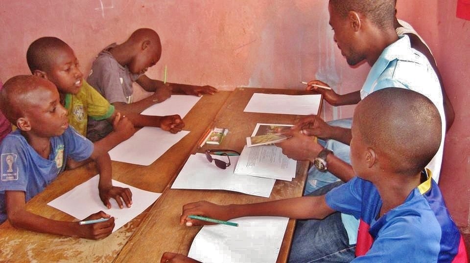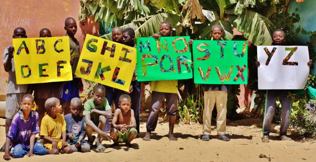 No sooner said than done. That day, Anna and Annette had come to help us. We set up the desks from the classrooms in the garden and grouped the children by age and ability. We all recited the alphabet while writing the letters on cardboard poster boards. The children were very attentive and eager to know what was going to happen with these letters. Diodio explained to the children that they had to fill in the letters by cutting pieces of fabric that were spread around on the tables and then pasting these inside the letters. At first we had to insist on some order because the children naturally wanted to cut and paste everything together. However, they soon realized that if they worked as a team they would have more have fun than by squabbling. If at first they hesitated a little and wondered how to do it, they surprised us all once they realized we had complete confidence in them.