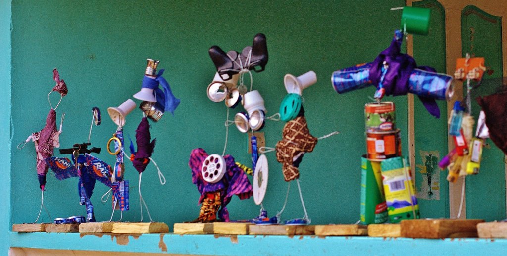 The children plunge right into the activity; they twist and cut the iron wire until it takes the shape that they want. They pierce the plastic and cut the fabric scraps, watching from the corner of their eye what their neighbor is doing and, when they see an idea they like, they copy it or try to improve on it. They bang in the nails, cut cans and tissues and, little by little, they see the results of what they imagined taking shape and are impatient to see their finished creation.