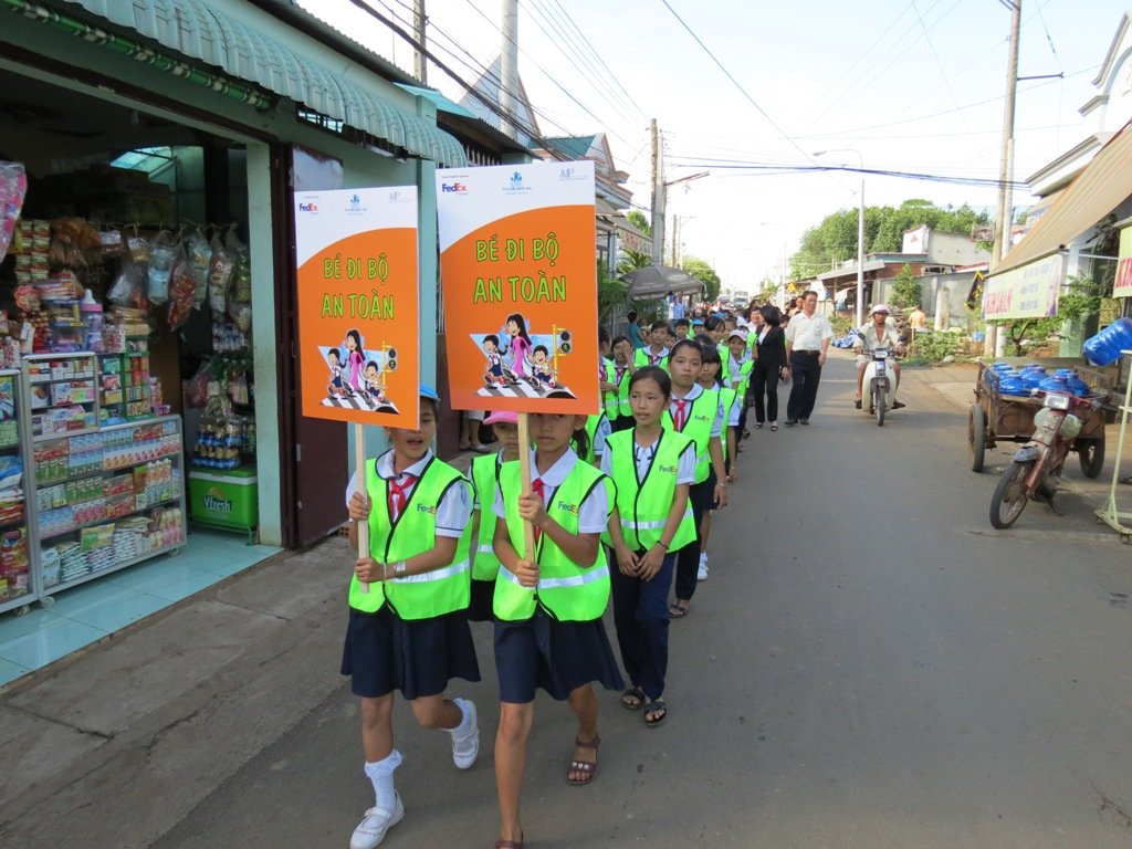 At Nguyen Tri Phuong Primary School in Dong Nai Province near Ho Chi Minh City, 80% of the students walk to school every day along busy streets. Therefore, FedEx and Safe Kids Vietnam (implemented by AIP Foundation) carried out pedestrian safety interventions at the school. Traffic lights, rumble strips, zebra crossings, and traffic signs were installed and 700 reflective jackets were distributed to the students. Teachers were trained in road safety education and given tools for hands-on teaching. A traffic safety corner with four working traffic lights and an intersection was set up in the playground to help students put their classroom learning into practice.