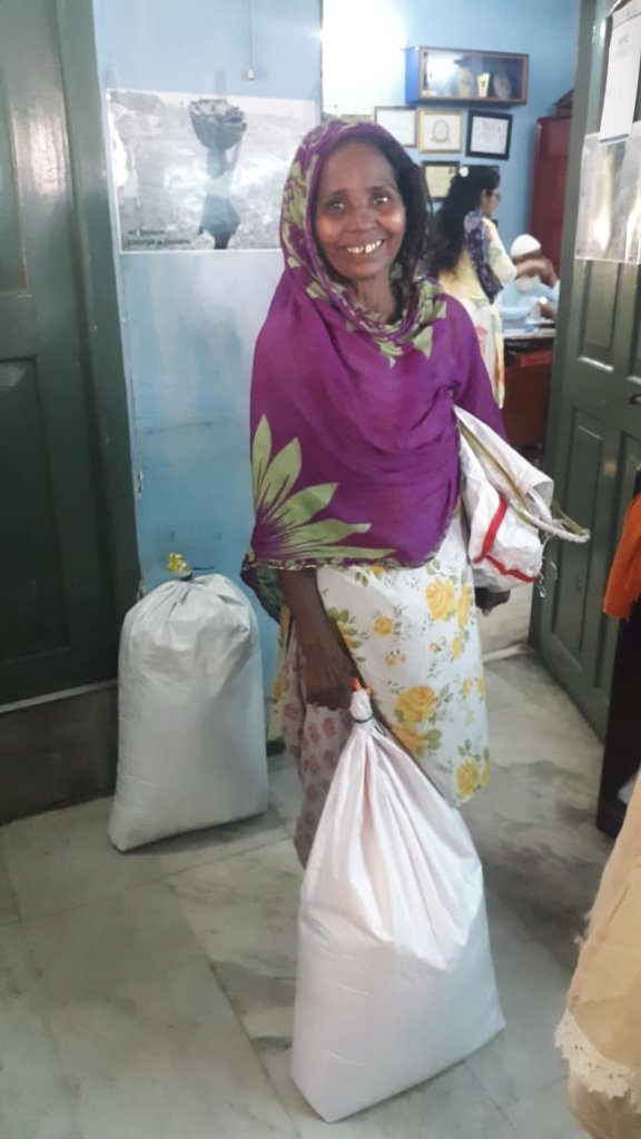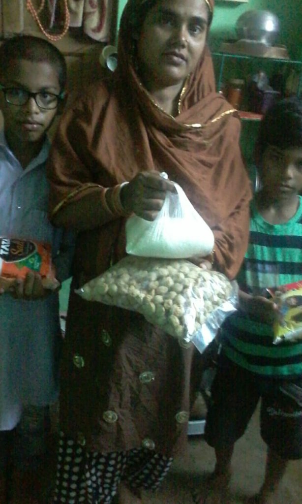 Moijan is married to a drunkard who very often abuses her both physically and verbally and does not give any money for the upkeep of the family. The burden of looking after the family has fallen on Moijan shoulders and she has been struggling since then. She has 6 members in the family. Since her husband is good for nothing, she has taken charge of her household. This ration will enable the family to survive as they are now going through a very tough time.