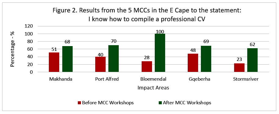 The outcomes achieved are mainly measured by the results from a questionnaire, but the comments from participants such as Princess Makhata from Makhanda, provide more insight into the benefits for the youth that attend the MCCs: “What I gained from the MCC is how to write a proper CV using a new format and I also learnt about my career. The career planning was very informative. I gained more knowledge on hard and soft skills and got to learn about career management. Now that I know what career path I am taking, this has assisted me in creating a network that will benefit my career and increase my chances of getting employed. I have also gained confidence to job hunt as I know what is expected of me. I now have a greater understanding on how to find a job. Other job-readiness workshops don’t have the variety of workshops the MCC offered”.