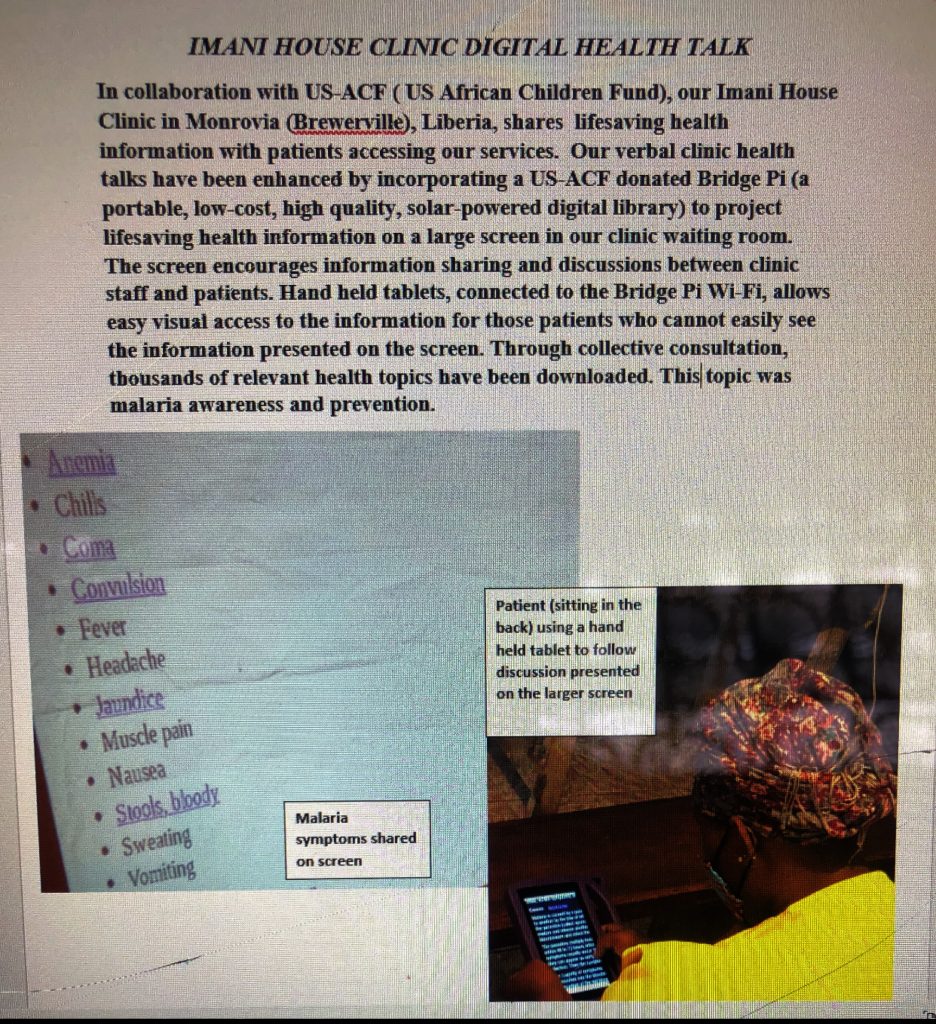 We continue using Bridge Pi as the primary tool for delivering in-clinic health education to all patients every week. Maybe you would like to sponsor this health education project so we can reach more people in the community and children in the schools. If you didn't recall from previous reports, BridgePi is a small hand computer. The device can be connected to a projector so health info can be projected on a screen or wall as a picture, chart, or video. This allows for quickly reaching a more significant number of persons. The digital device also creates a wifi network for patients with smartphones or tablets to connect their devices to directly access health information reviewing and downloading content for free while in the Clinic during presentations by staff. IHI provides tablets to patients during sessions(courtesy of ACF-US African Children Fund). Would you, too, like to donate a tablet or smartphone to the project?
