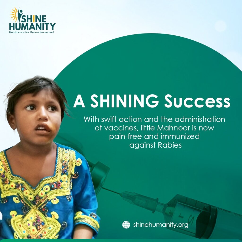 Mahnoor has always been terrified of the stray dogs that roamed in her neighbourhood, but one day she was bitten on the face by a rabid dog. Her parents were not sure of what care was available, they rushed to a hospital in Thatta, however they were unable to get treatment for her due to a shortage of rabies vaccines - a necessary measure in case of rabid animal bites. Luckily the attending physician was aware of the Rabies Program at the SHINE Humanity Garibsons Facility in Gharo, and referred Mahnoor to SHINE Humanity