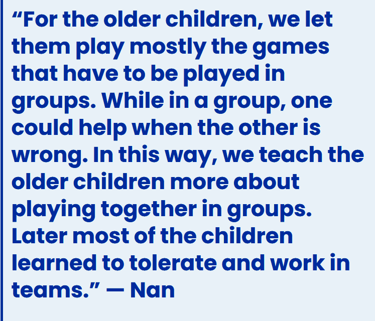 We let the older children play mostly games that have to be played in groups. They play in groups so that they can get to know each other better. This way, if someone makes a mistake, they can get help from the others in the group. This is how we teach the older children to play together in groups.