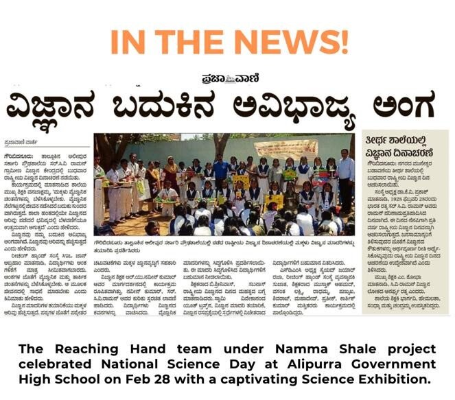 The Reaching Hand team under Namma Shale project celebrated National Science Day at Alipurra government High school, Bangalore on the 28th of Feb with a science exhibition. The event was a learning for the students.Attached is a newspaper clipping that came out in our local language.