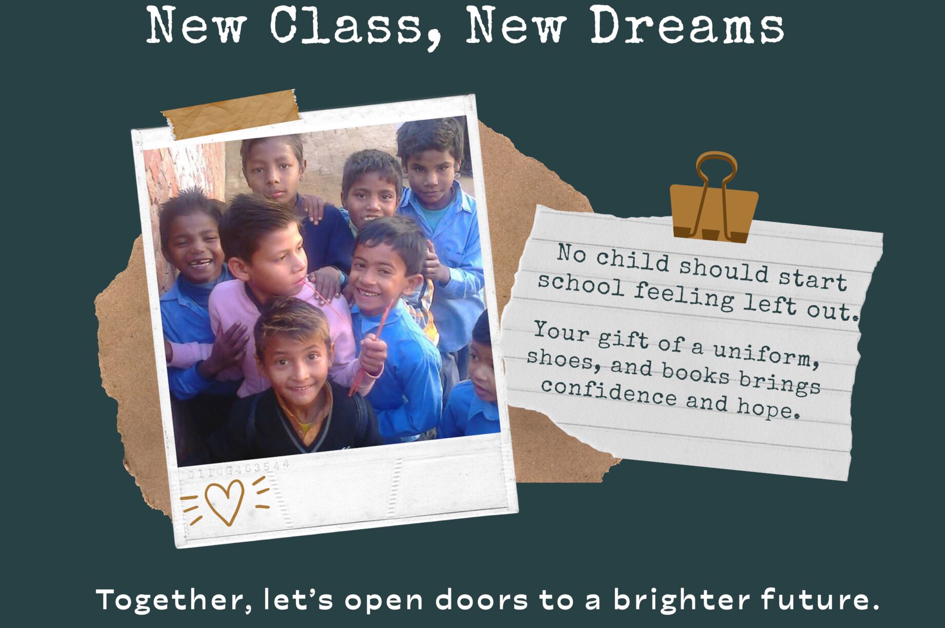 "New Class, New Dreams" gives 100 underprivileged children the joy of starting school with dignity. Many arrive barefoot, without uniforms or books, feeling left out. This project provides school kits with uniforms, shoes, books, and bags. A small gift brings big hope. Together, we can turn their fear into confidence and their classroom into a place where dreams begin.
